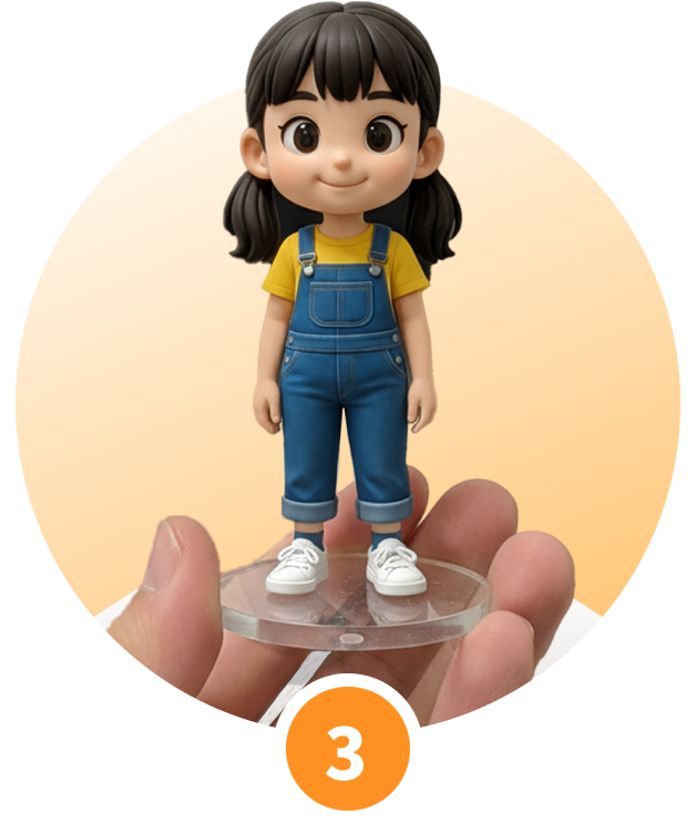 Turn your photo into a hyper-detailed, custom 3D chibi figurine. We capture your unique style—from signature smile to favorite outfit—using advanced modeling and printing. More than a toy, it's a premium collectible.